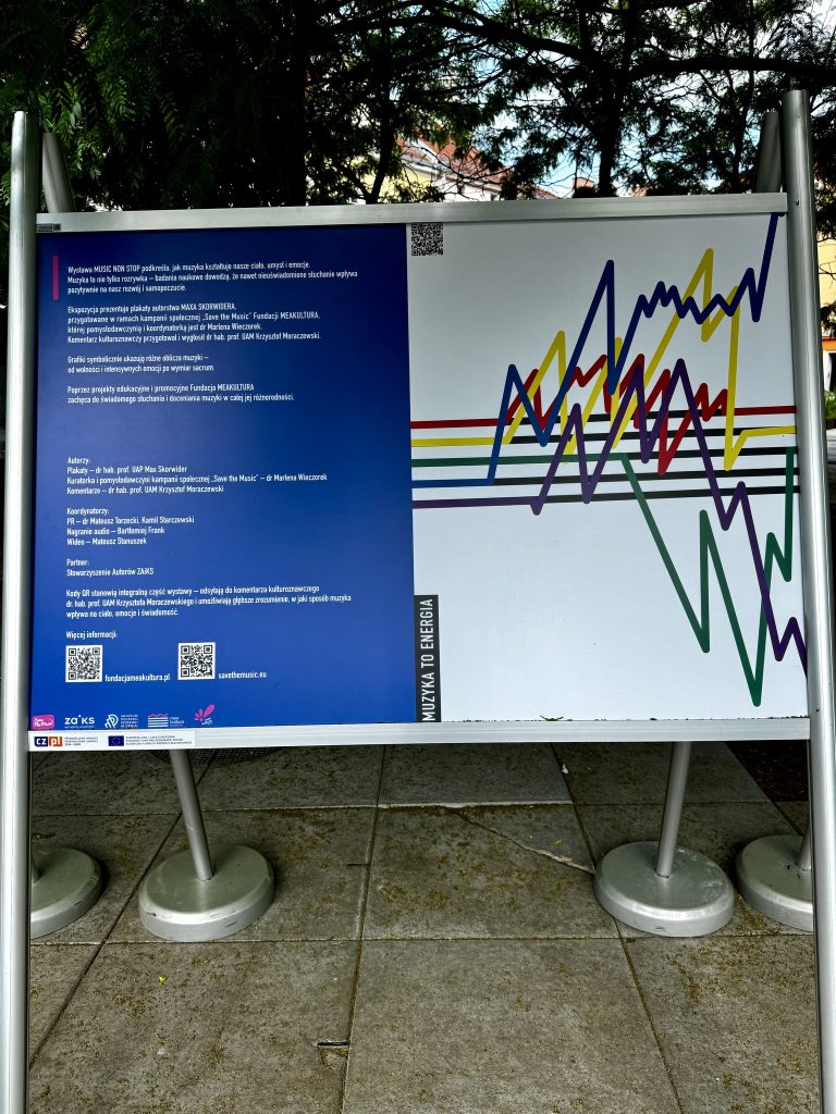 Wystawa MUSIC NON STOP to kolejna ekspozycja plakatów autorstwa MAXA SKORWIDERA, przygotowanych w ramach kampanii społecznej „Save the Music” Fundacji MEAKULTURA, której pomysłodawczynią i koordynatorką jest dr Marlena Wieczorek. Komentarz kulturoznawczy (QR kod) przygotował i wygłosił dr hab. prof. UAM Krzysztof Moraczewski.
